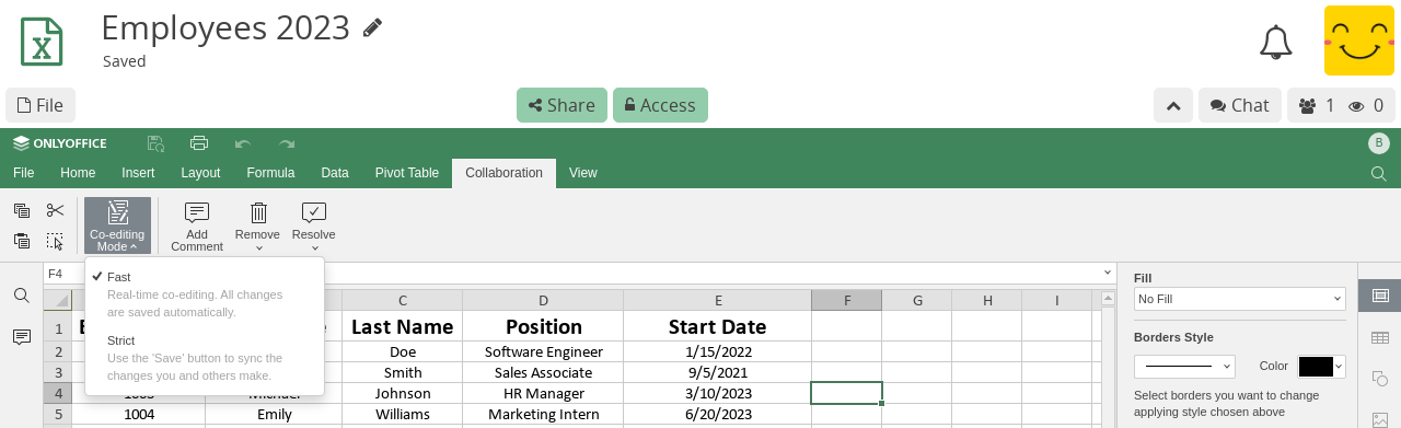 OnlyOffice provides two collaborative editing modes in spreadsheets that affect how changes are synced between users and whether or not the Undo functionality is available.